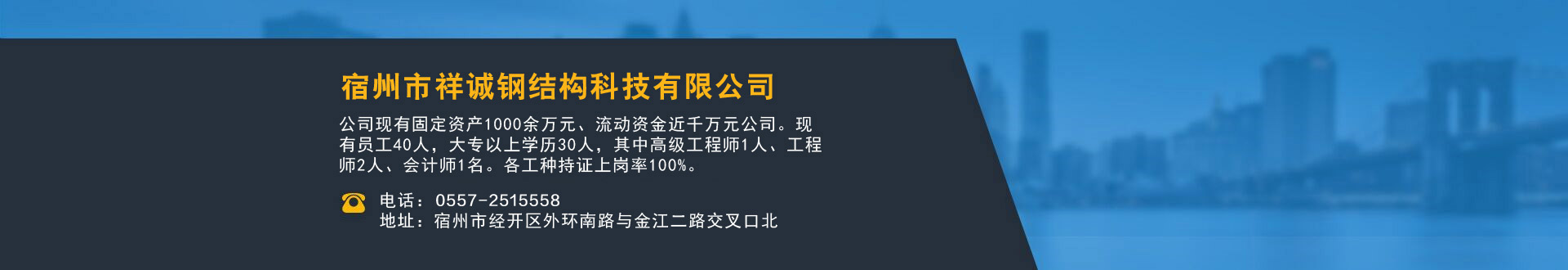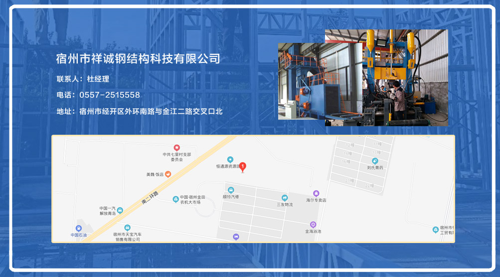 宿州市祥誠鋼結(jié)構(gòu)科技有限公司位于宿州市經(jīng)開區(qū)外環(huán)南路與金江二路交叉口北,公司是一家以建設(shè)產(chǎn)業(yè)化為目標(biāo),匯集大型鋼結(jié)構(gòu)廠房、彩鋼活動房設(shè)計、制作、安裝施工一條龍服務(wù)的知名鋼結(jié)構(gòu)公司。公司現(xiàn)有固定資產(chǎn)1000余萬元、流動資金近千萬元公司。現(xiàn)有員工40人,大專以上學(xué)歷30人,其中高級工程師1人、工程師2人、會計師1名。各工種持證上崗率100%。高效化的年青團(tuán)隊為公司帶來了蓬勃發(fā)展的動力,全體員工以務(wù)實的態(tài)度,拼搏的精神,創(chuàng)造著企業(yè)的每一天。      公司組織結(jié)構(gòu)嚴(yán)格按現(xiàn)代企業(yè)制度設(shè)計,管理機(jī)構(gòu)設(shè)置合理,制度完善,各部門分工明確...